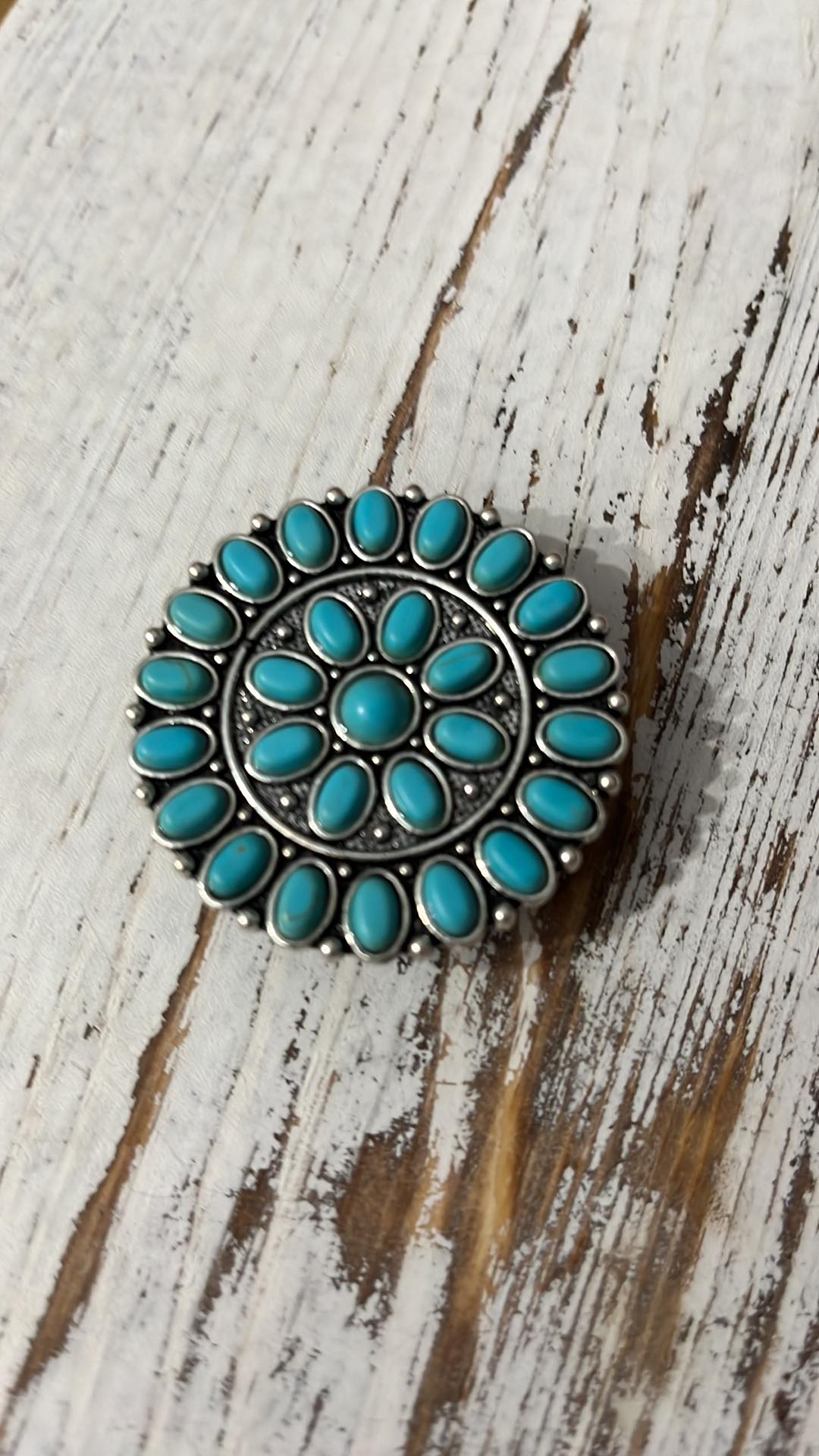 Enhance your phone's style with our Textured Flower Concho Phone Pop Socket. Made of turquoise and featuring a western fashion concho, this accessory not only adds a touch of fashion to your device, but also provides a secure grip for easier handling. Elevate your phone experience today.