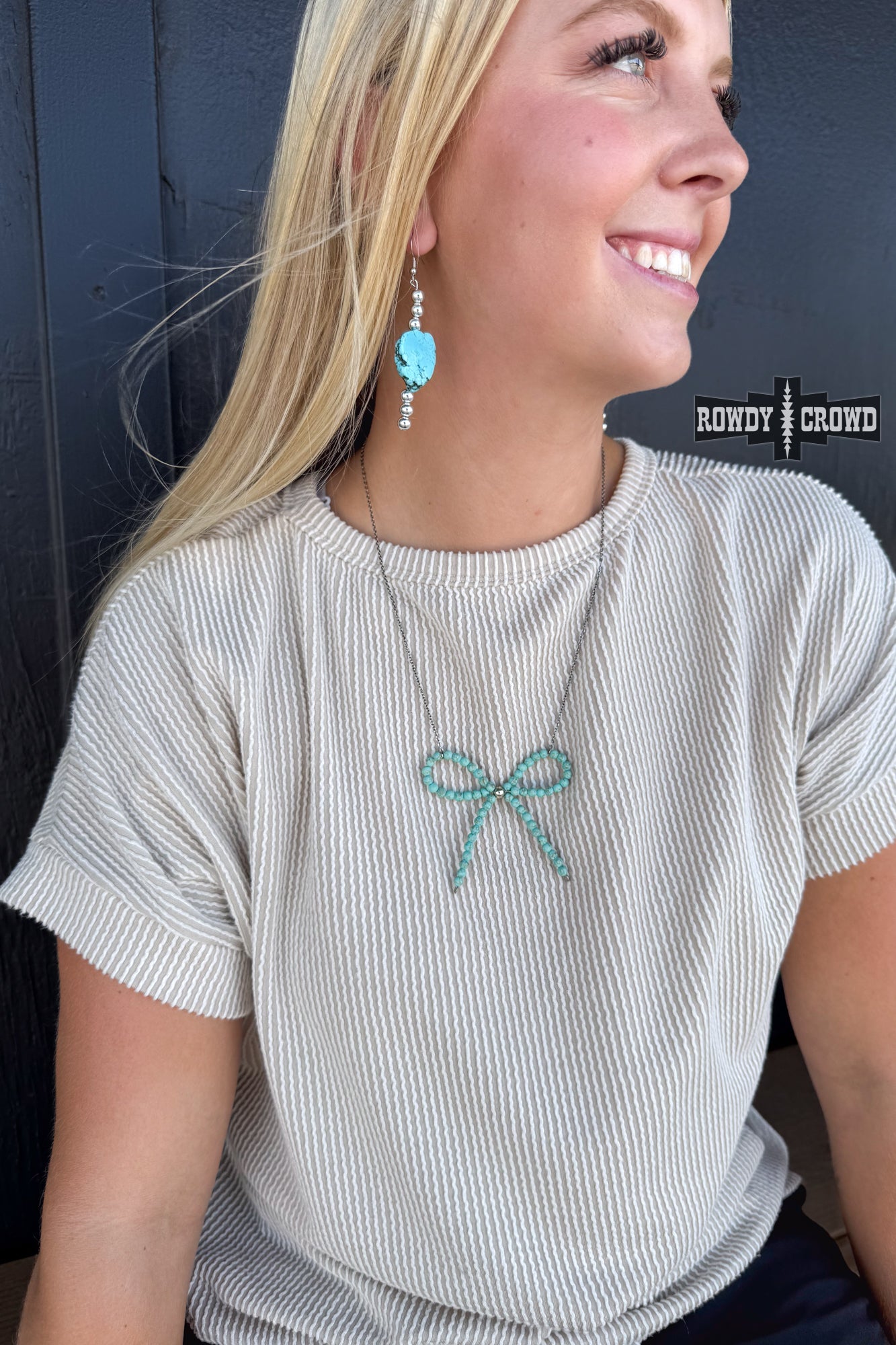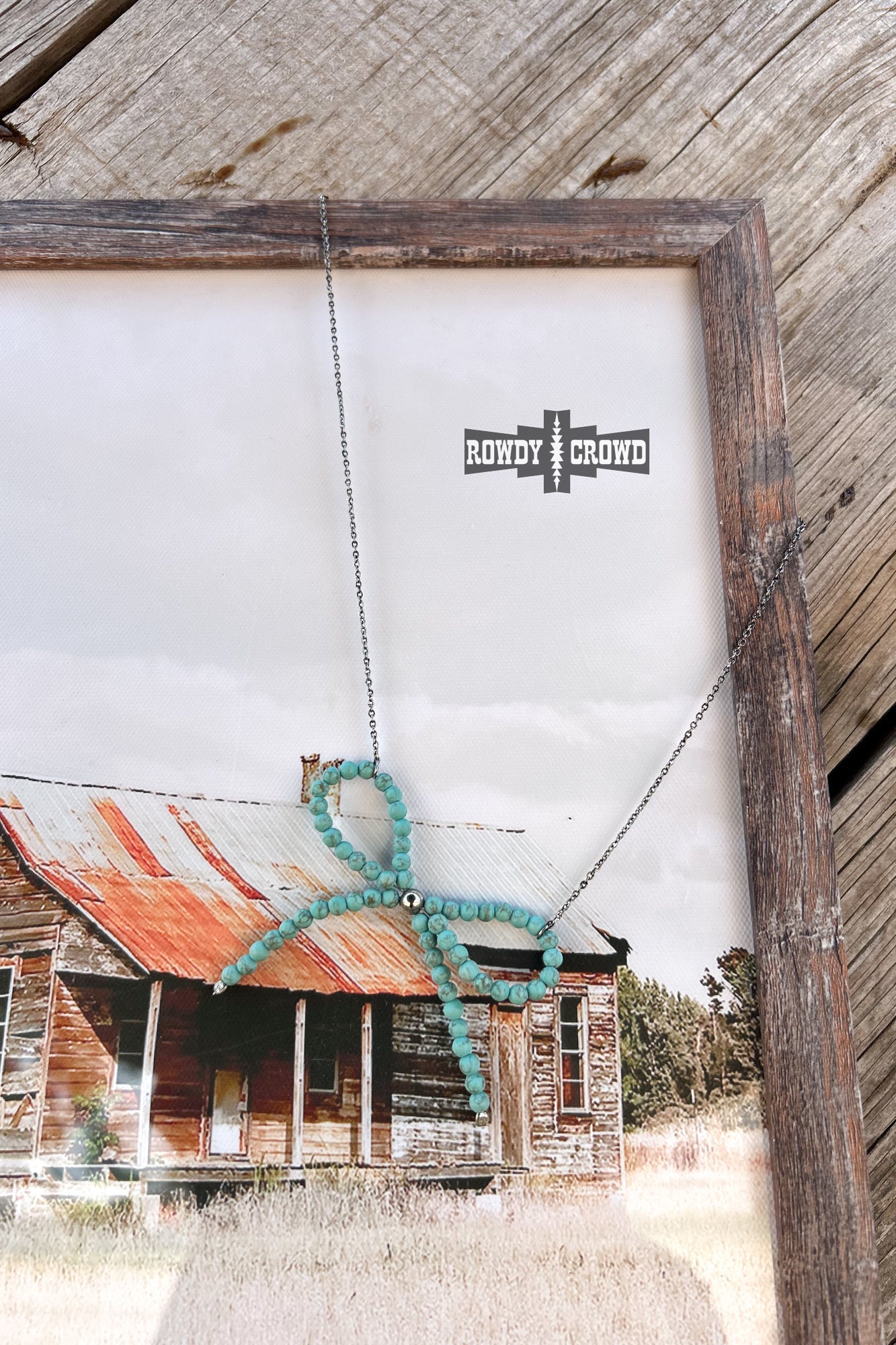 The viral pearl bow necklace is new and improved! Our Blue Bow Necklace is sterling silver featuring teal Navajo pearls shaped like a bow. This necklace truly captures the elegance and grace of the Wild West. Accent your blouses or a simple graphic tee for a laid back, stylish look.