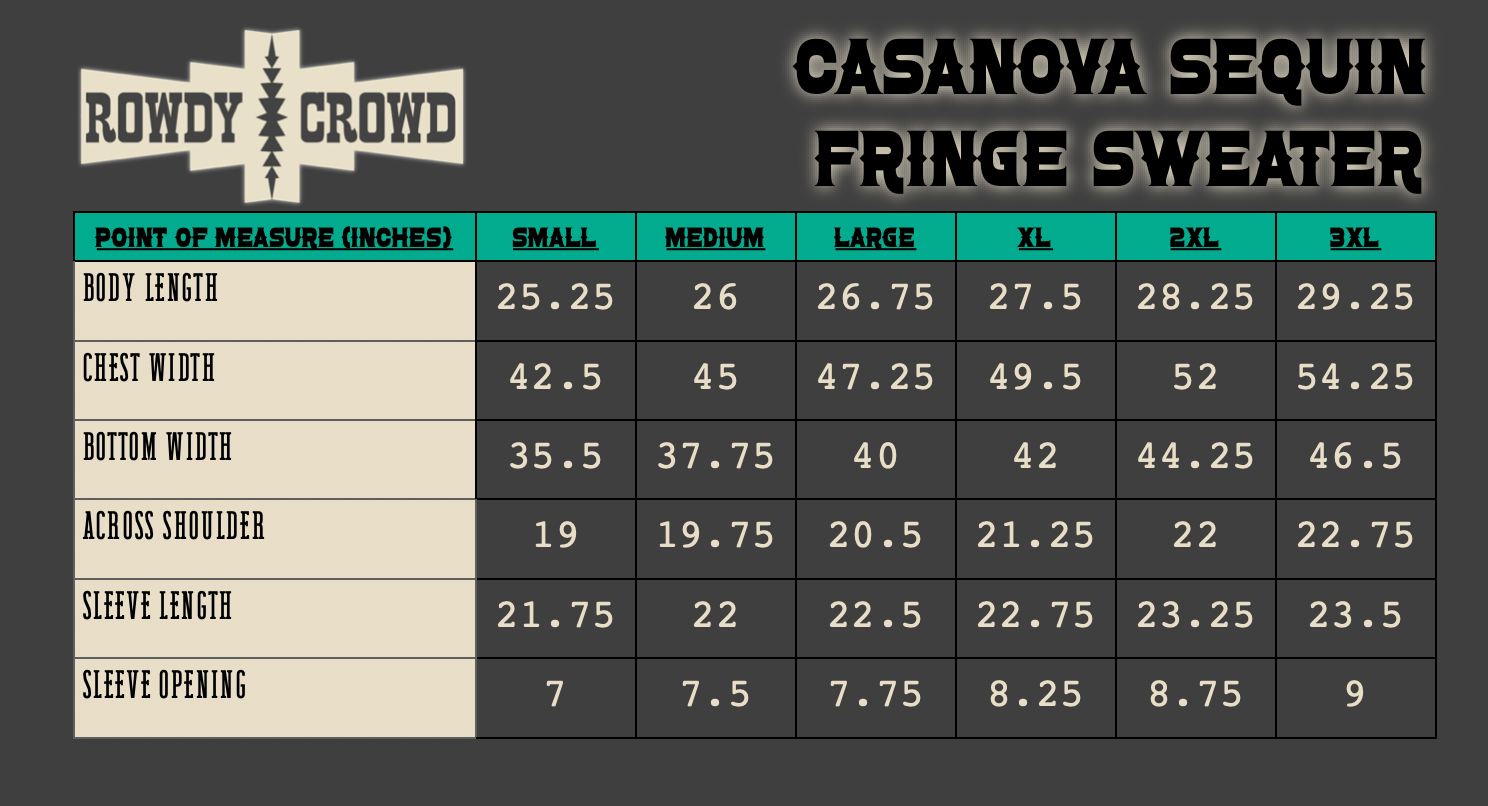 The Casanova Sequin Fringe Sweater is the perfect mix of comfy and cute. The brightly colored sequin aztec and bronc rider stand out on the front of this beautiful sweater and just for a little extra, we added sequin fringe. The relaxed fit makes it perfect to dress up or down.