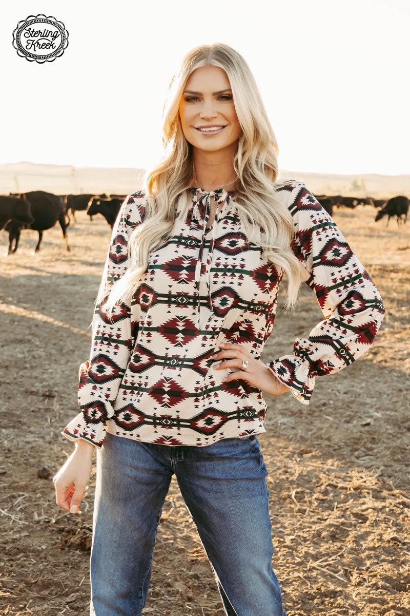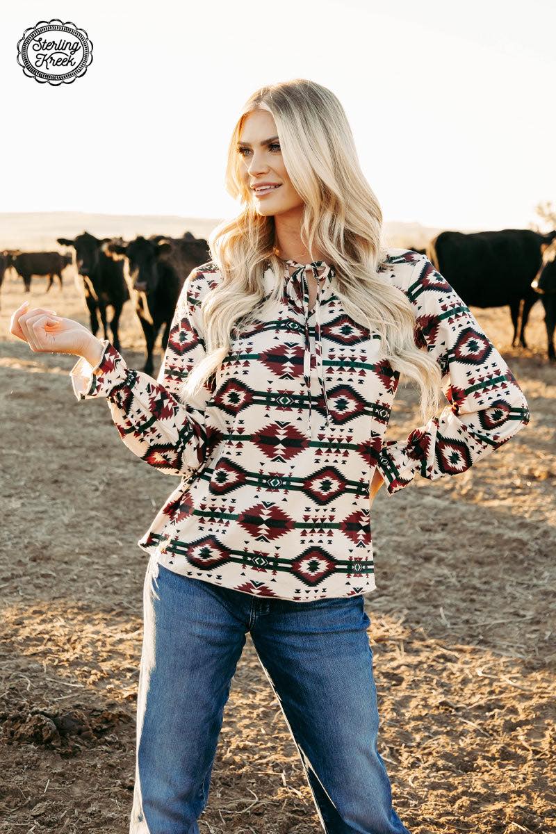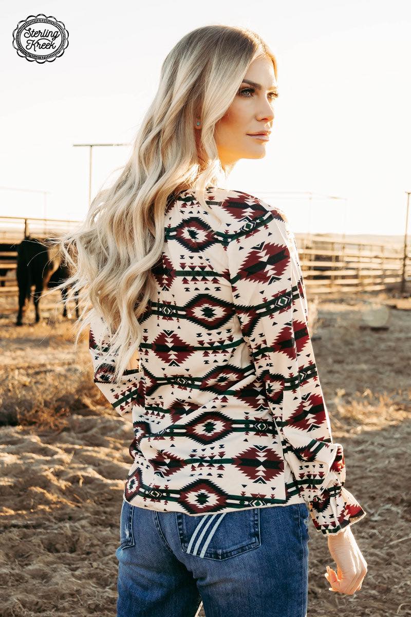 Take your style to a whole new level with this YOU SERIOUS CLARK TOP! This cream top will instantly give your wardrobe an elevated charm. The maroon and green aztec design is unique and modern, helping you make your own fashion statement. Get ready to turn heads!