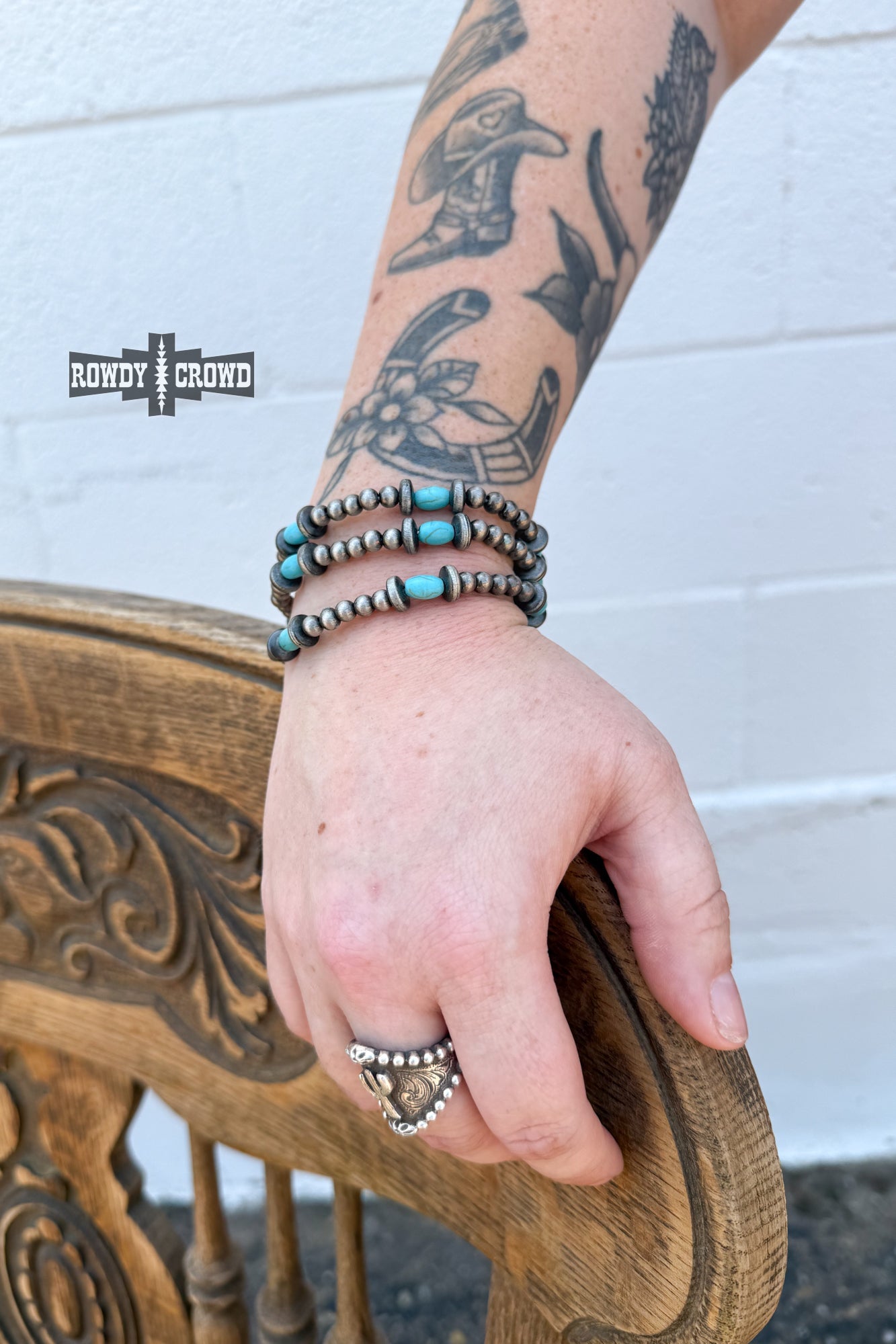 Turn heads with a pop of turquoise and a whole lot of western charm with our Blazing Saddles Bracelet. This stretch bracelet features vibrant turquoise accents spaced perfectly between rustic, silver-toned Navajo pearls. It's a standout piece on it's own, but stacks effortlessly with your other favorites!