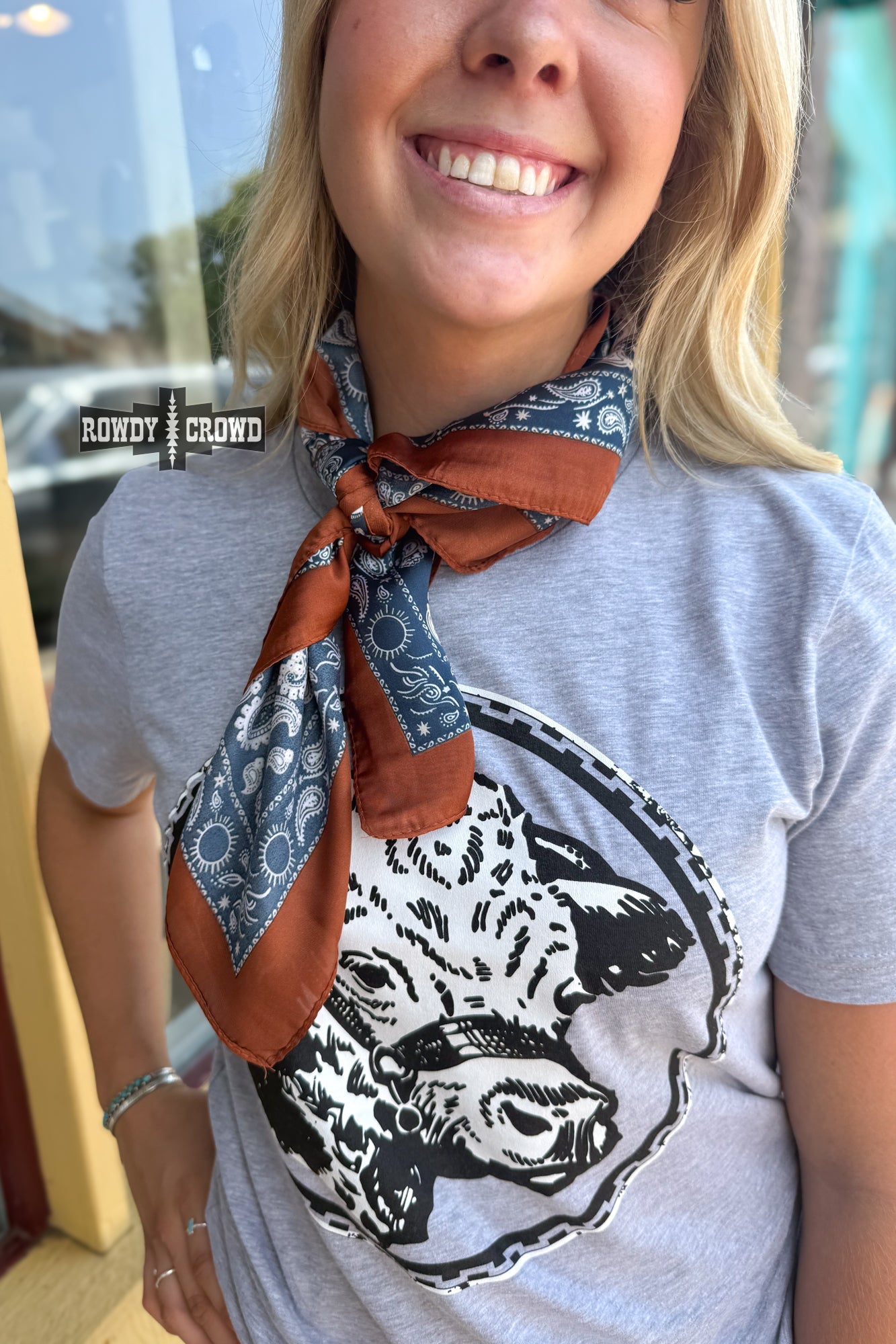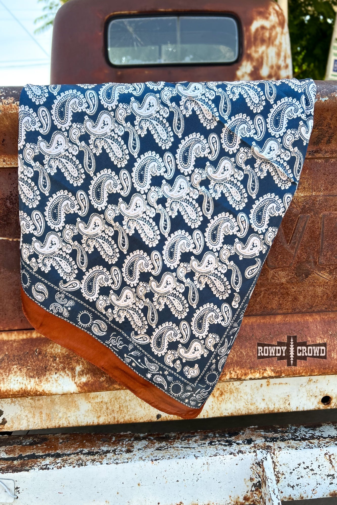 Add a touch of western charm with the SMALL Prophets & Outlaws wild rag, featuring a crisp white paisley pattern on a navy blue base, and a bold brown border. Perfect for styling around the neck, in your hair, or on your gear, it’s a versatile piece for any cowboy or cowgirl.