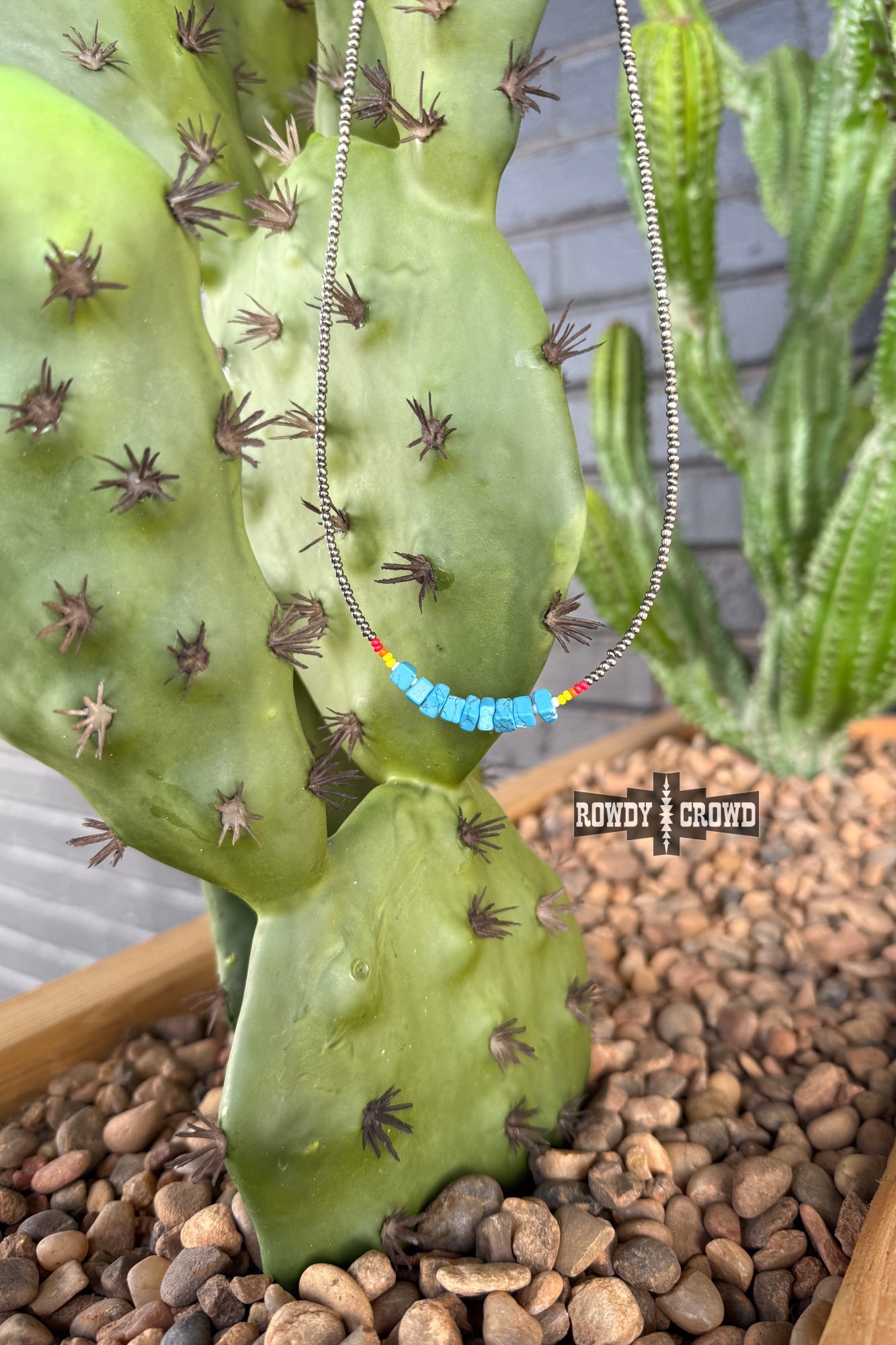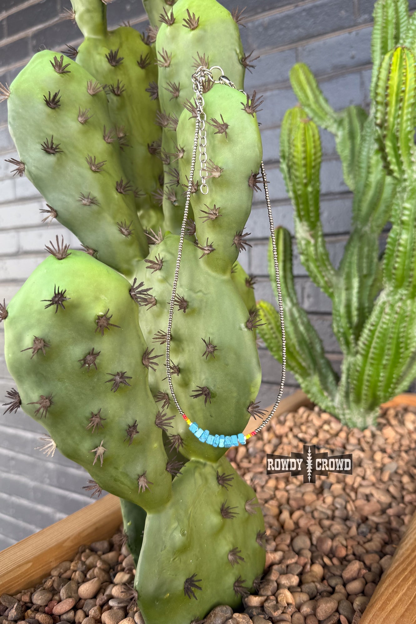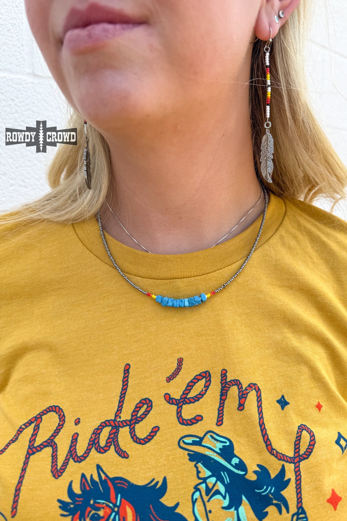 The Vaquera Necklace will add a subtle touch of color to any outfit, a strand of silver beads featuring red, yellow, orange and white beads surrounding turquoise rocks in the center. This necklace is perfect for the cowgirls who prefer smaller jewelry or love to layer with every outfit!